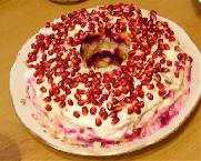 Верх хорошо смазать майонезом и посыпать (красиво украсить) гранатовыми зёрнами. Дать чуть постоять. Аккуратно убрать стакан. Получается салат в виде браслета.