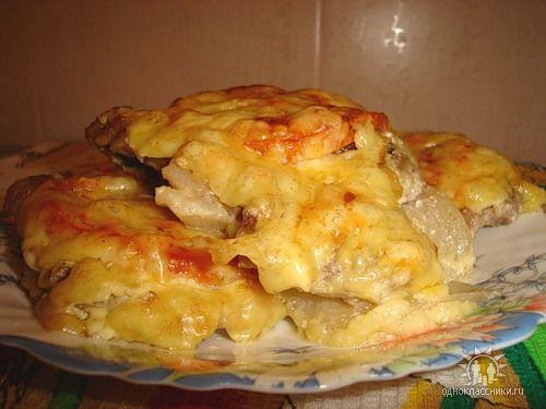 Мясо порезать мелкой соломкой и замариновать, как на шашлык. Для маринада взять соль, чёрный перец, чеснок, лавровый лист. Замаринованное мясо оставить на 3-4 часа. Лук 2-3 головки порезать полукольцами, посолить, поперчить и оставить на час. Картофель нарезать тонкими пластинками и перемешать со сметано-майонезным соусом(1*1). Из готового, замаринованного мяса убрать лаврушку и выложить его на противень, сверху маринованный лук, затем картофель, засыпать тёртым сыром. Готовить в разогретой духовке до образования румяной корочки.
