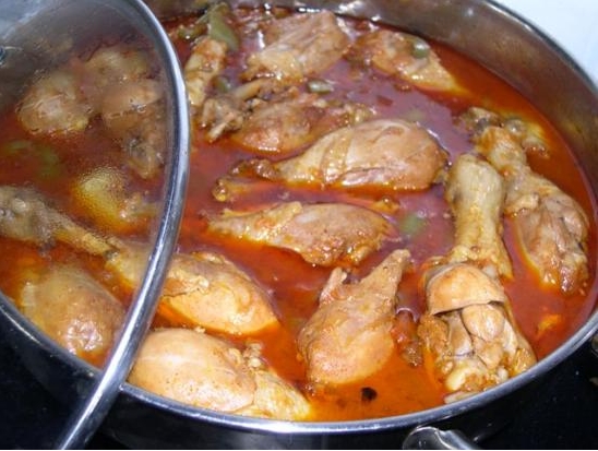 Поджарить лук в глубокой большой сковородке( или кастрюле) на небольшом огне под крышкой в течении минимум 20 минут. Лук должен стать прозрачным и слегка подрумяниться. Добавить в сковородку кусочки курицы, нарезанный помидор, нарезанный перец. Накрыть крышкой и тущить 10 минут вместе. Посыпать паприкой, хорошо размешать. Растворить в воде соль и перец и добавить к курице. Тушить на очень медленном огне 45-50 минут до готовности, точное время зависит от курицы. Минут за 5 до окончания тушения снять крышку, чтобы соус стал гуще. Выложить из соуса курицу, перец и помидор. Смешать сливки, лимонный сок и муку и влить их в соус, хорошо размешать. Вернуть курицу в соус. Прогреть курицу в соусе несколько минут.