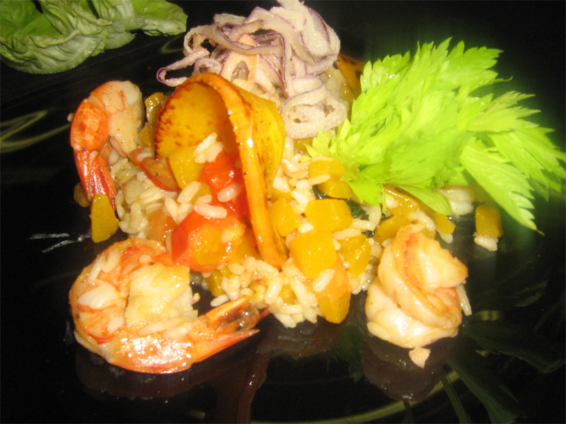1.На оливковом масле обжариваем креветки(предварительно очищенные от панциря),тыкву(кубиком),лук-шалот(кубиком) и помидоры черри(по полам).