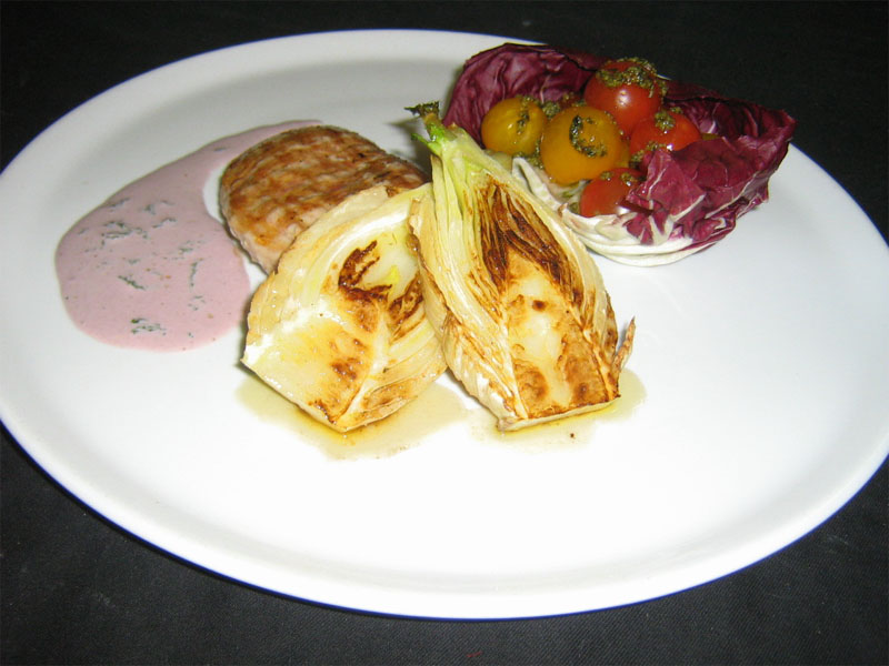 4.Мясо укладываем мясо, рядом кладем фенхель. Поливаем соусом, можно украсить салатом родичче и помидорами черри, соусом песто.