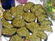 Баклажаны нарезать поперек толщиной примерно 1-1.5 см, посолить, поперчить, обмакнуть в взбитое яйцо и обжарить, просушить их на бумажном полотенце чтобы вышло лишнее масло. Перемешать мелко нарубленную зелень кинзы, чеснок, майонез, и мелкую красную икру. Когда баклажаны остынут, смазать их полученной смесью.
