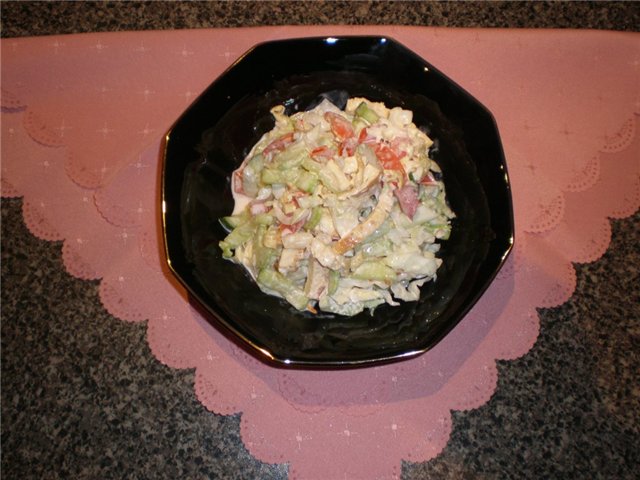 Выдавите чеснок, заправьте майонезом, немного ч. перца.
