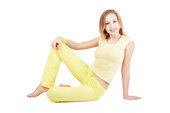 - Левую ногу согните в колене, стопа прижата к полу. Спина прямая.
