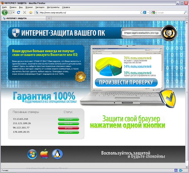 Ссылки на новый интерфейс онлайновых лже-антивирусов. На этот раз лже-антивирус распространяется под заголовком "Интернет-защита Вашего ПК".