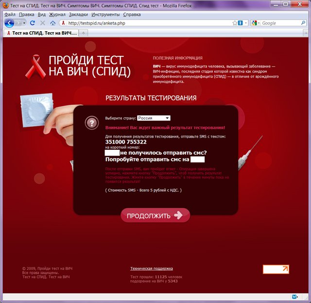 Так, один из сайтов предлагает пройти тест на заражение СПИДом, для чего требуется ответить на ряд вопросов. В итоге выясняется, что по результатам теста можно узнать только степень риска заражения СПИДом - точный ответ на поставленный вопрос может дать только специальный анализ крови. Кроме того, злоумышленники сообщают о том, что SMS-сообщение стоит 5 рублей. На самом же деле пользователь, согласившийся отправить сообщение, заплатит от 40 до 110 рублей.