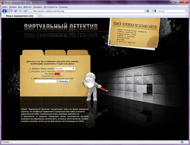 Перед тем как оплатить "услугу", пользователю предлагается ввести имеющуюся информацию о человеке, информацию по которому необходимо найти. После этого совершается якобы поиск, который очень быстро заканчивается. Для просмотра результатов необходимо отправить платное SMS-сообщение.