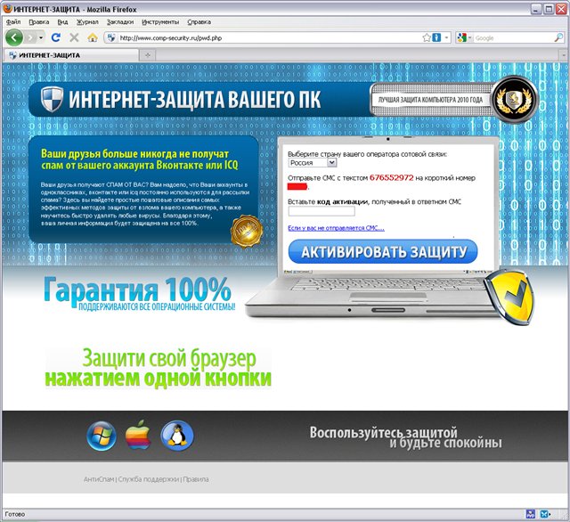 Стоимость платного SMS-сообщения за фиктивную защиту, предлагаемую авторами лже-антивируса, составляет около 300 рублей.
