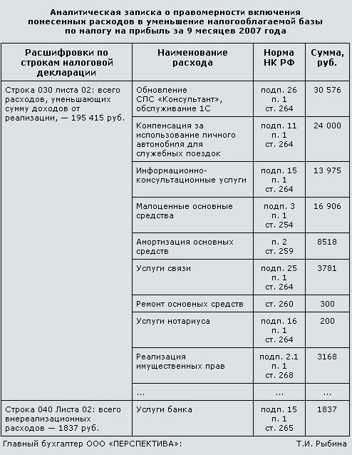 Итак, фирма получила требование о представлении документов в виде пояснений, подтверждающих причины образования убытка по результатам финансово-хозяйственной деятельности. Такого документа в финансово-хозяйственной деятельности не существует, поэтому его предстоит создать самим. Дополнительно налоговики могут запросить аналитическую записку главного бухгалтера — о правомерности включения понесенных расходов в налоговую базу. На чем основаны такие требования налоговиков?